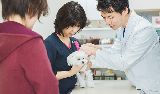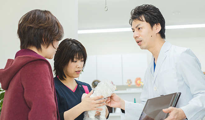 当院は、オーナー様とペットちゃんの、一生涯のあらゆる場面をサポートする動物病院を目指しています。病気の時はもちろんのこと、健康な時も気になることは何でもお聞き下さい。直接お越しいただいても、お電話でも構いません。先ずは、皆様の最良の相談相手になりたいと思っています。大切な家族との幸せな時間が少しでも長くなるよう、精一杯がんばらせていただきますのでよろしくお願いします。